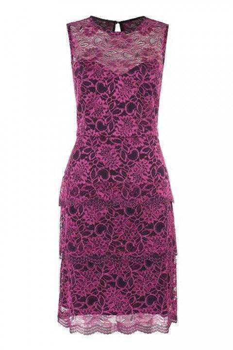 7. Rochia violet debordeaza de senzualitate, atat datorita culorii, cat si a dantelei care imbraca fundamentul tinutei. Pentru ca are volane in partea inferioara, este indicat de purtat de femeile care au silueta atletica, fara curburi in zona soldurilor si a posteriorului. Femeile cu silueta tip atlet pot obtine un plus de feminitate si senzualitate optand pentru aceasta rochie.