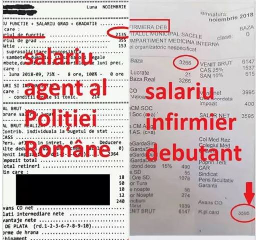 Bogdan Banica, vicepresedintele Sindicatului National al Politistilor din Romania SNPR DECUS, a publicat pe Facebook doi fluturasi de salariu, cel al unui infirmier debutant si cel al unui politist care are o vechime de zece ani.